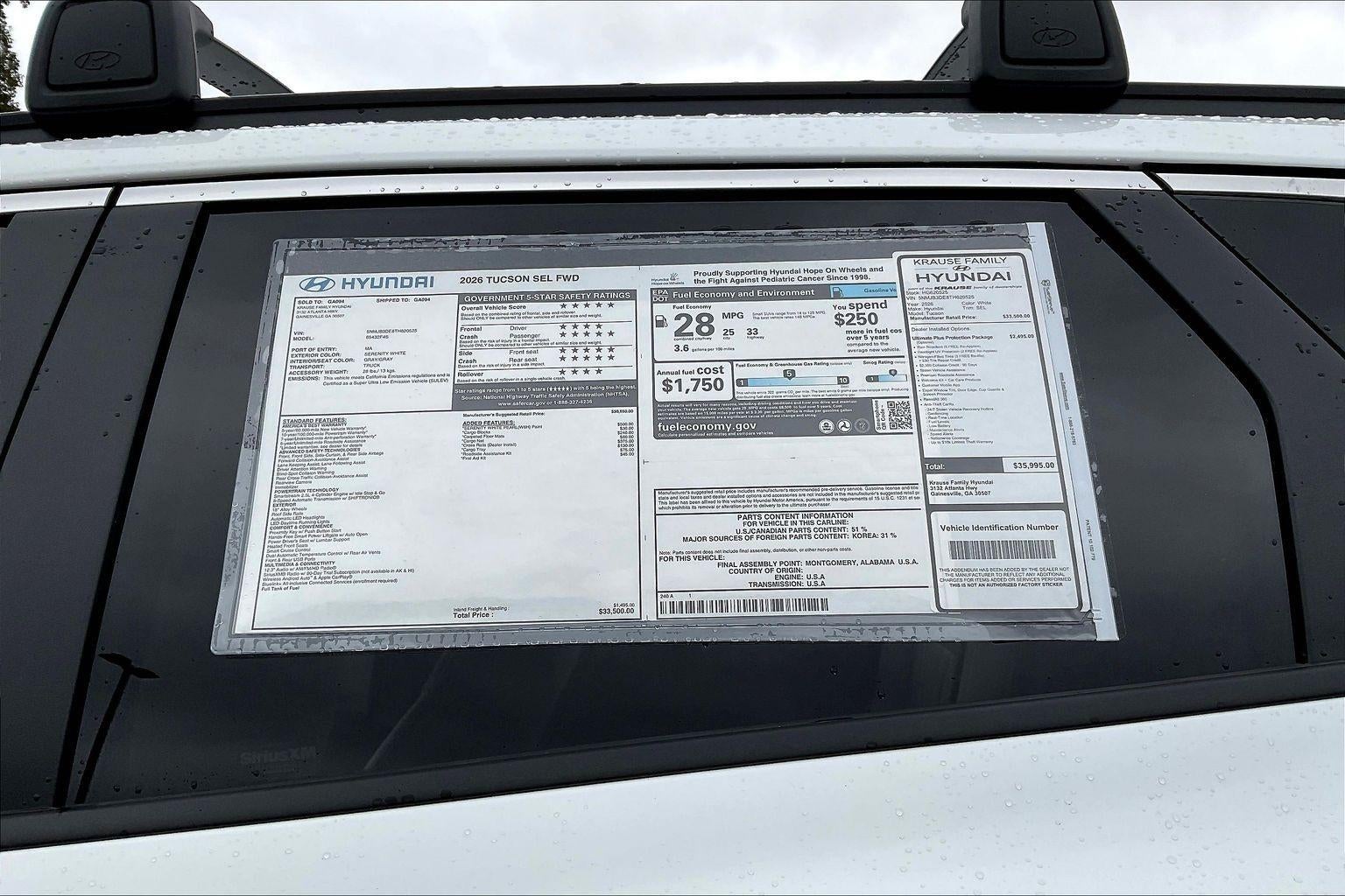 White Pearl 2026 Hyundai Tucson SEL FWD 8-Speed Automatic with SHIFTRONIC 2.5L I4 DGI DOHC 16V LEV3-SULEV30 187hp KRAUSE FAMILY HYUNDAI HAS ALL LISTED SALES PRICES WITH DEALER FEES INCLUDED-WE ARE ONE OF THE FEW DEALERS TO DO SO! WHEN SHOPPING GET YOUR QUOTES IN WRITING.